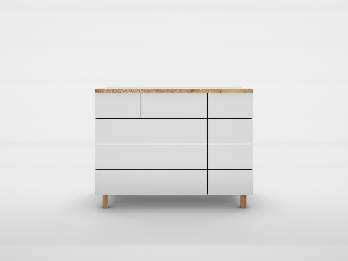 לשידת שנהב חלוקת מגירות יחודית, משטח עליון עשוי פורניר אלון מבוקע ורגלי עץ אלון.
