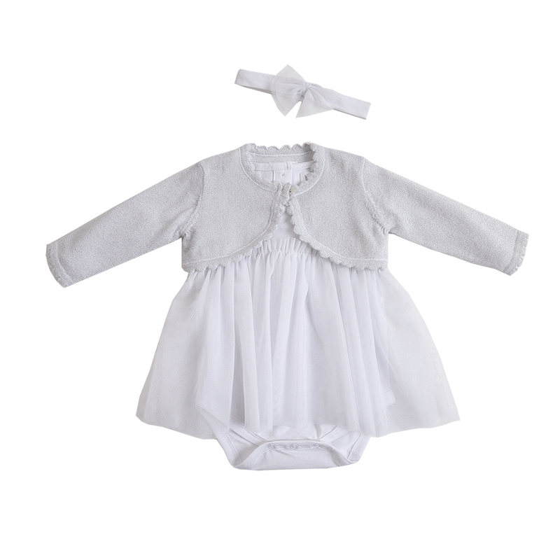 ליין מיוחד לחגיגות הולדת הבייבי שלכם. המארז כולל: שמלת בגד גוף עם טול, קרדיגן, סרט ראש וגרביונים.