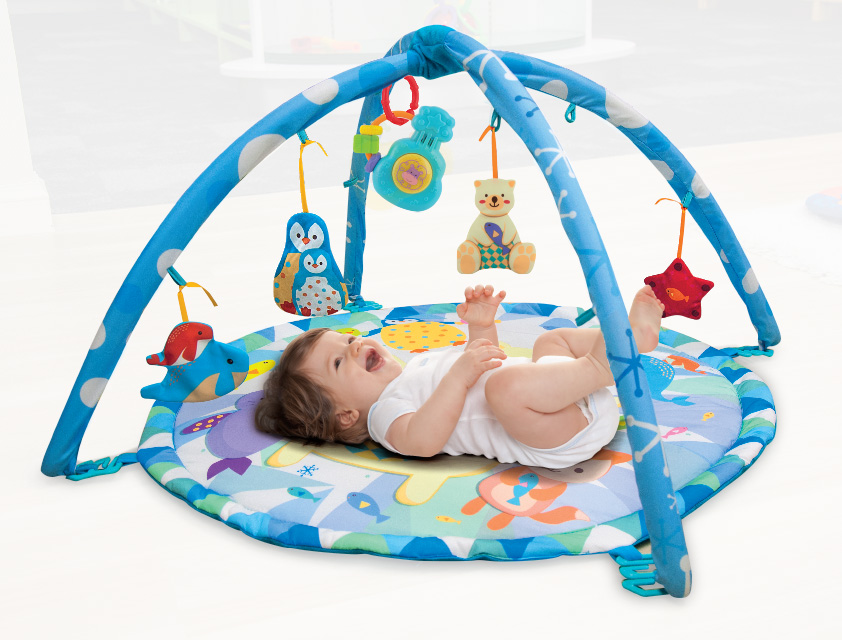 משטח משחק ולמידה לתינוק מאוייר בדמויות חיות צבעוניות ומתוקות. המשטח משלב אוניברסיטה עם קשתות וצעצוע נתלה אורקולי.