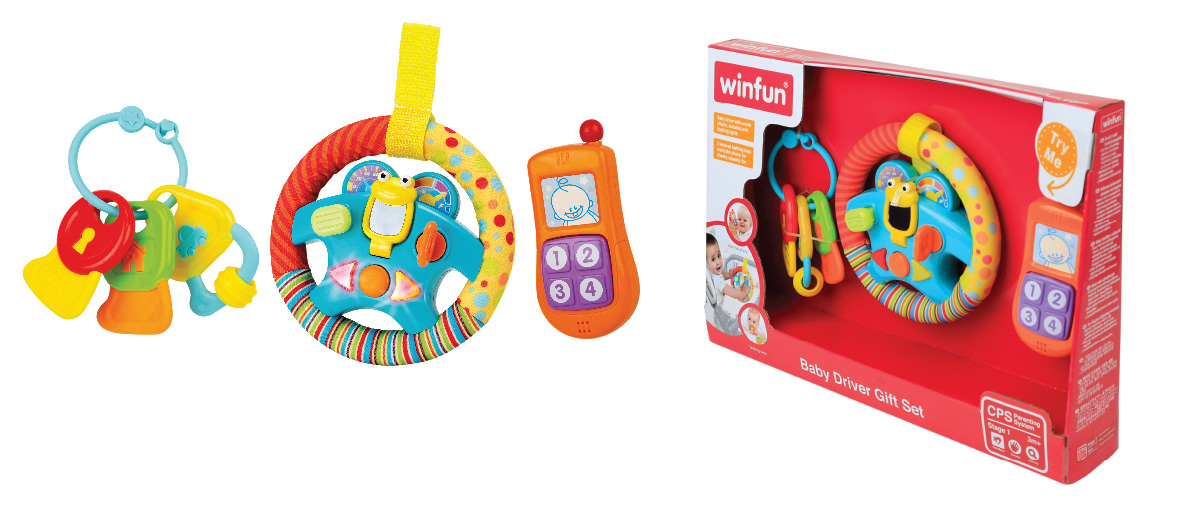 סט הנהג הצעיר כולל פעלולון הגה נתלה לטיולון או ללול, מפתחות נשכן ושלט עם מספרים.