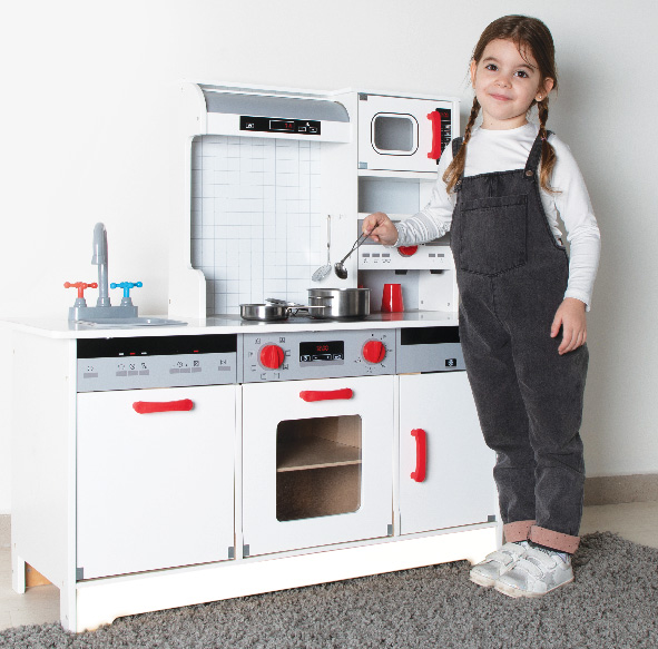 מטבח צעצוע ענק המרגיש כמו מטבח אמיתי לשעות משחק רבות ומהנות. כולל – כיור,ברז,דלפק, כיריים, ארונות,מיקרוגל , מקרר, תנור אפייה, מדיח כלים, מכונת קפה וכלי בישול.