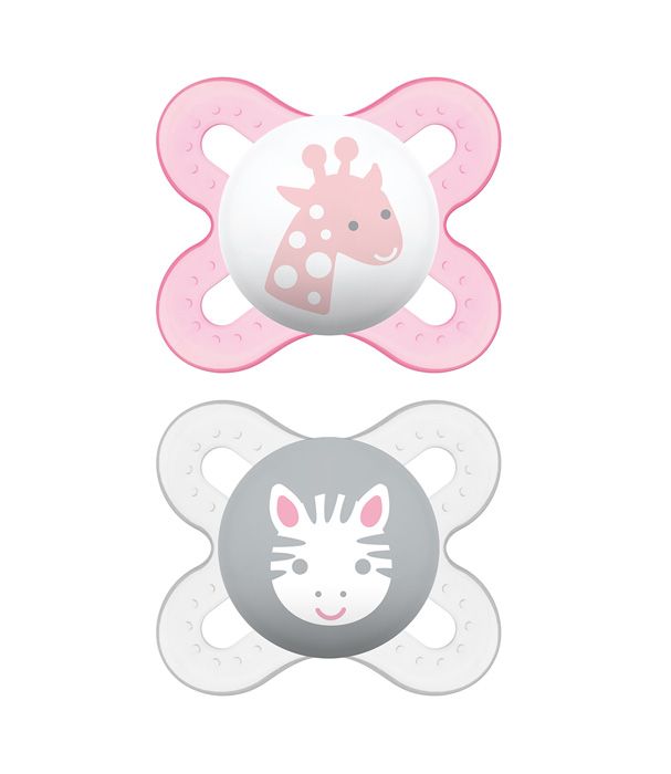 זוג מוצצי מאמ מסיליקון לגיל 0-2 חודשים, מתאים לתינוק שנולד, עם פטמה אורתודנטית סימטרית וגודל שילדה קטן.