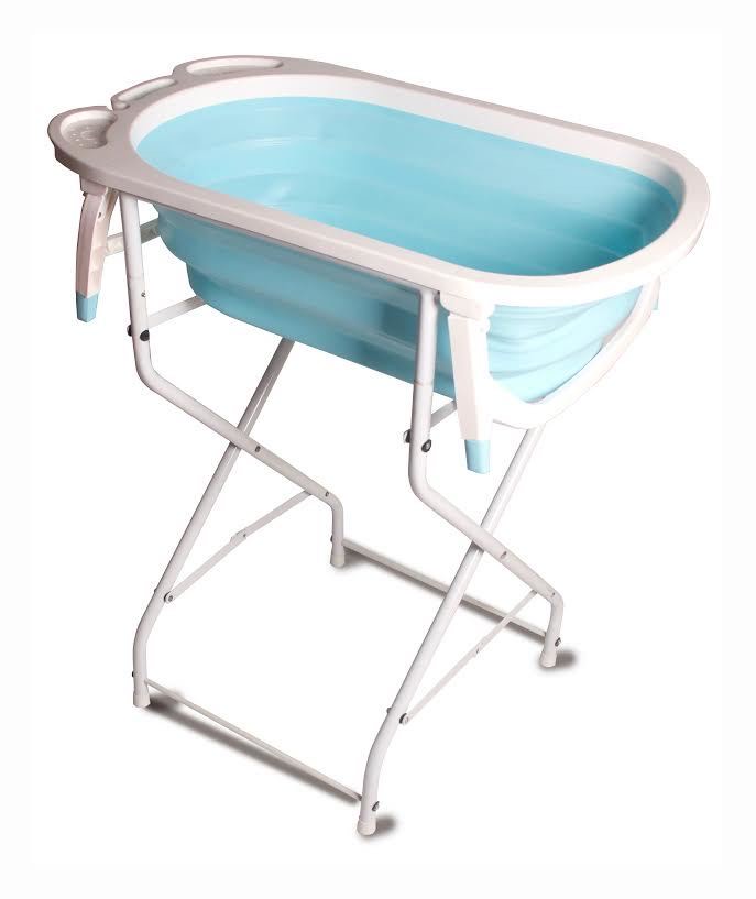 אמבטיה מתקפלת לתינוק עשויה פלסטיק חצי קשיח והמאפשר קיפול למצב שטוח, מגיע כולל מעמד.
