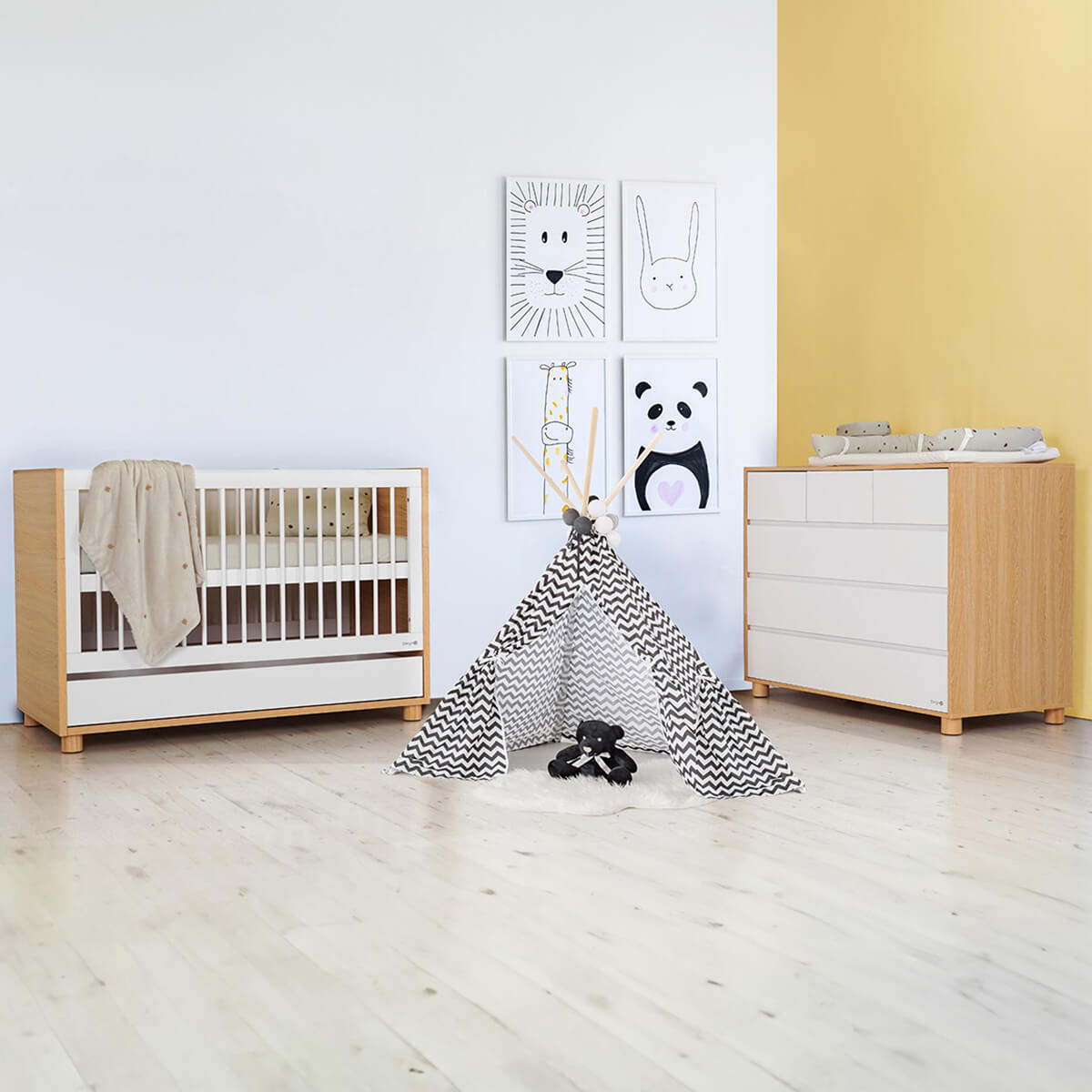 חדר לתינוק הכולל מיטת תינוק דגם קורי ההופכת למיטת מעבר ושידה דגם טיילור—שידת טיילור 120 ס"מ– בשידה זו שילוב של 2 סוגי המגירות, 3 מגירות רחבות ו-3 מגירות צרות, עם גישה נוחה לכל פריט, לשימוש אופטימלי וניצול מקסימלי—מיטת תינוק קורי עם בסיס מתכוונן ל- 2 מצבי גובה: מצב עריסה ומצב מיטת תינוק—הופכת בקלות למיטת מעבר ברכישת מגן למיטת מעבר בתוספת תשלום—המיטה מצוידת במגירה גדולה לאחסון עם גישה נוחה—מידות חיצוניות של המיטה: 135/76 ס”מ—מידות מזרן: 130/70 ס”מ—מידות שידת טיילור: 120(רוחב) 60(אורך) 95(גובה) ס”מ