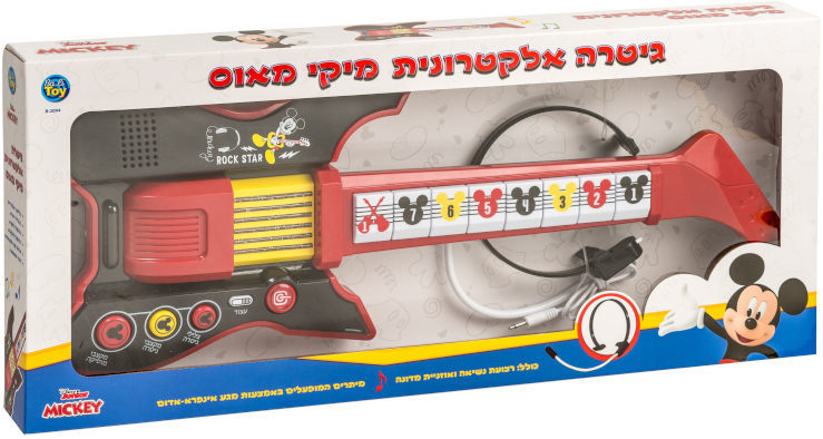 "גיטרה אלקטרונית מיקי מאוס + אוזניית מדונה • מיתרים המופעלים על ידי מגע אינפרא אדום. • 8 לחצני אקורדים משתנים. • 8 מקצבי גיטרה. • 8 מקצבי מוזיקה לבחירה. • אורות קצב מהבהבים. • כיבוי אוטומטי. • יש להשתמש ב-3 סוללות 1.5 aa (לא כולל סוללות). גיל: 3+ מידות אריזה רוחב 58 ס""מ, אורך 25 ס""מ, עומק 6 ס""מ.
