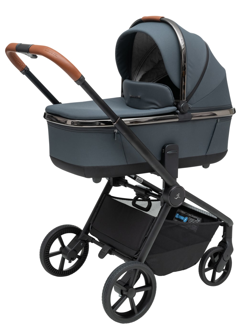 העגלה בעיצוב יוקרתי של כרום שחור לסל השכיבה וגגון הטיולון המעניק לה לוק אלגנטי במיוחד.
